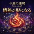 「星空の背景に金の装飾枠。右上に宝石風の獅子の顔エンブレム、左上に星座の線。大きな金文字で『獅子座 今週の運勢 2/2〜2/8 最強週間』と書かれた占いバナー」 しし座