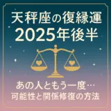 ※2025年後半の復縁戦略(3つのステップなど)は「てんびん座の復縁運【2025年後半】」で確認できます。